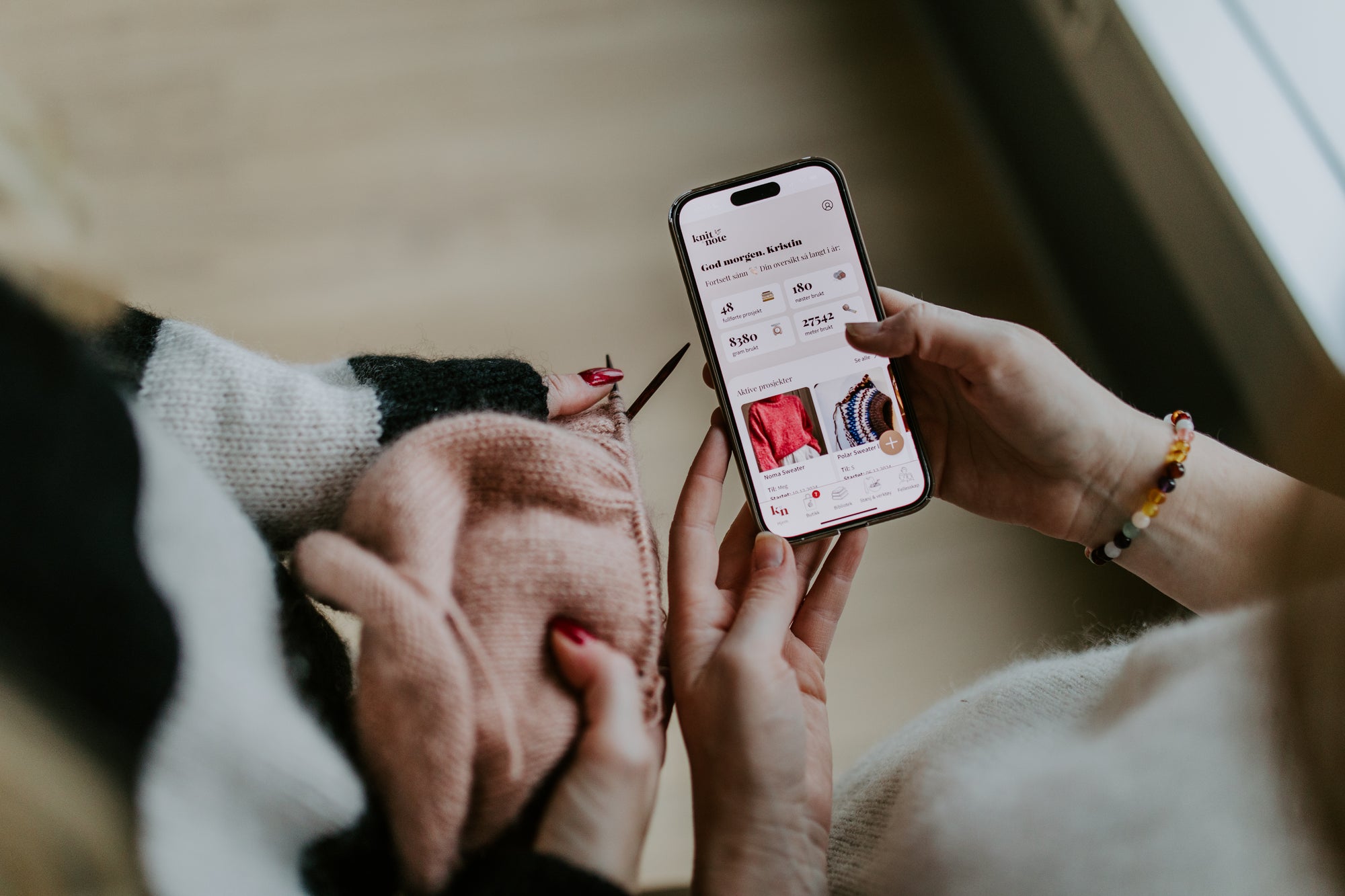 You’ll always have the project with you on your phone, and with helpful tools og video tutorials, you’re ready to knit anywhere, anytime 🧶